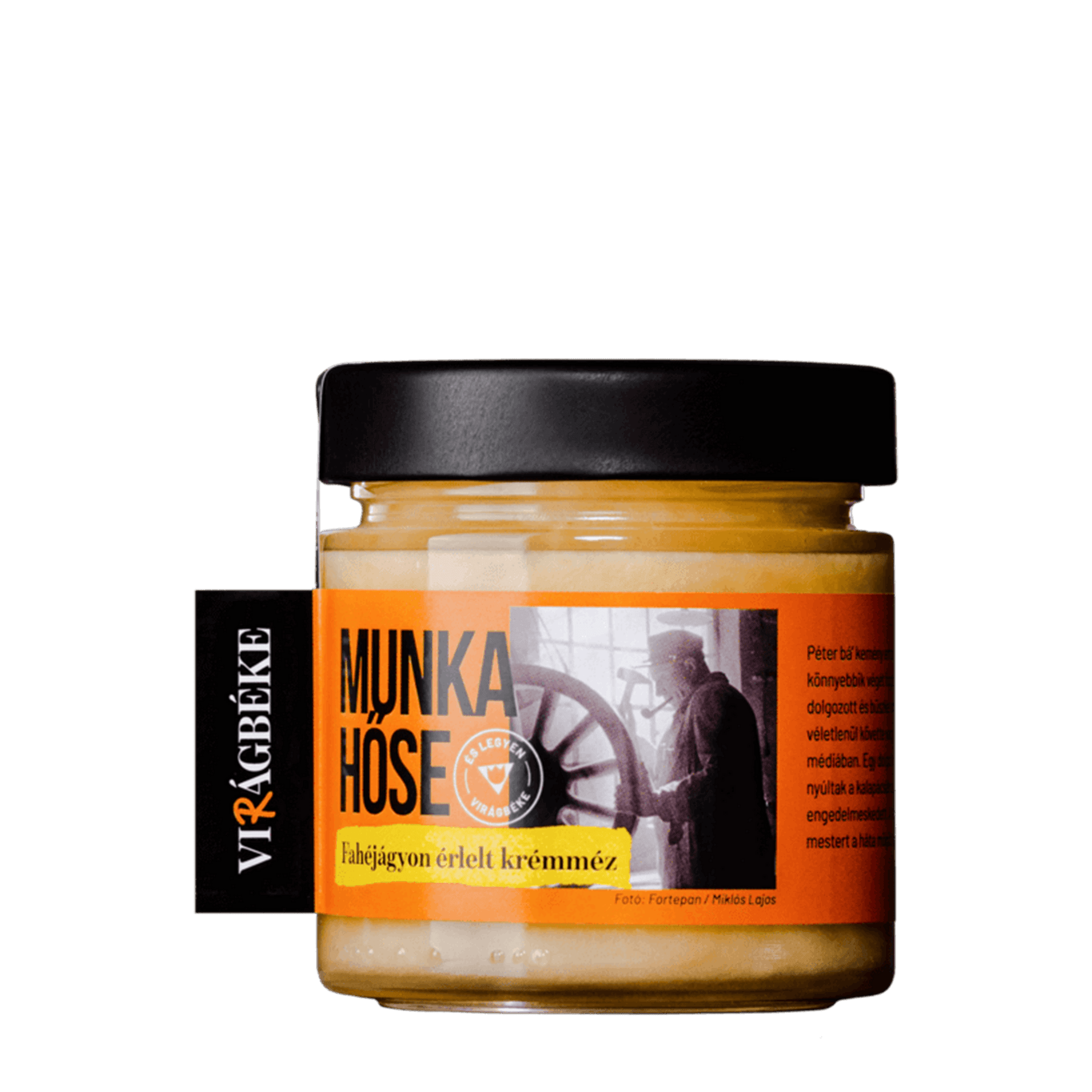 A krémmézen Péter bá’ látható, a mester, aki sosem fogta meg a dolgok könnyebbik végét. Kemény munkájával kivívta tiszteletét (nem véletlenül követték ezrek a közösségi médiában), de volt egy szent tárgy, amihez nem nyúlhatott senki: a kalapácsa. Mert az csak neki engedelmeskedett. Ezért nevezték a tanoncok a mestert a háta mögött úgy, hogy a répáshutai Thor! Ez a méz is Péter bá’ kitartását és erejét hordozza magában.